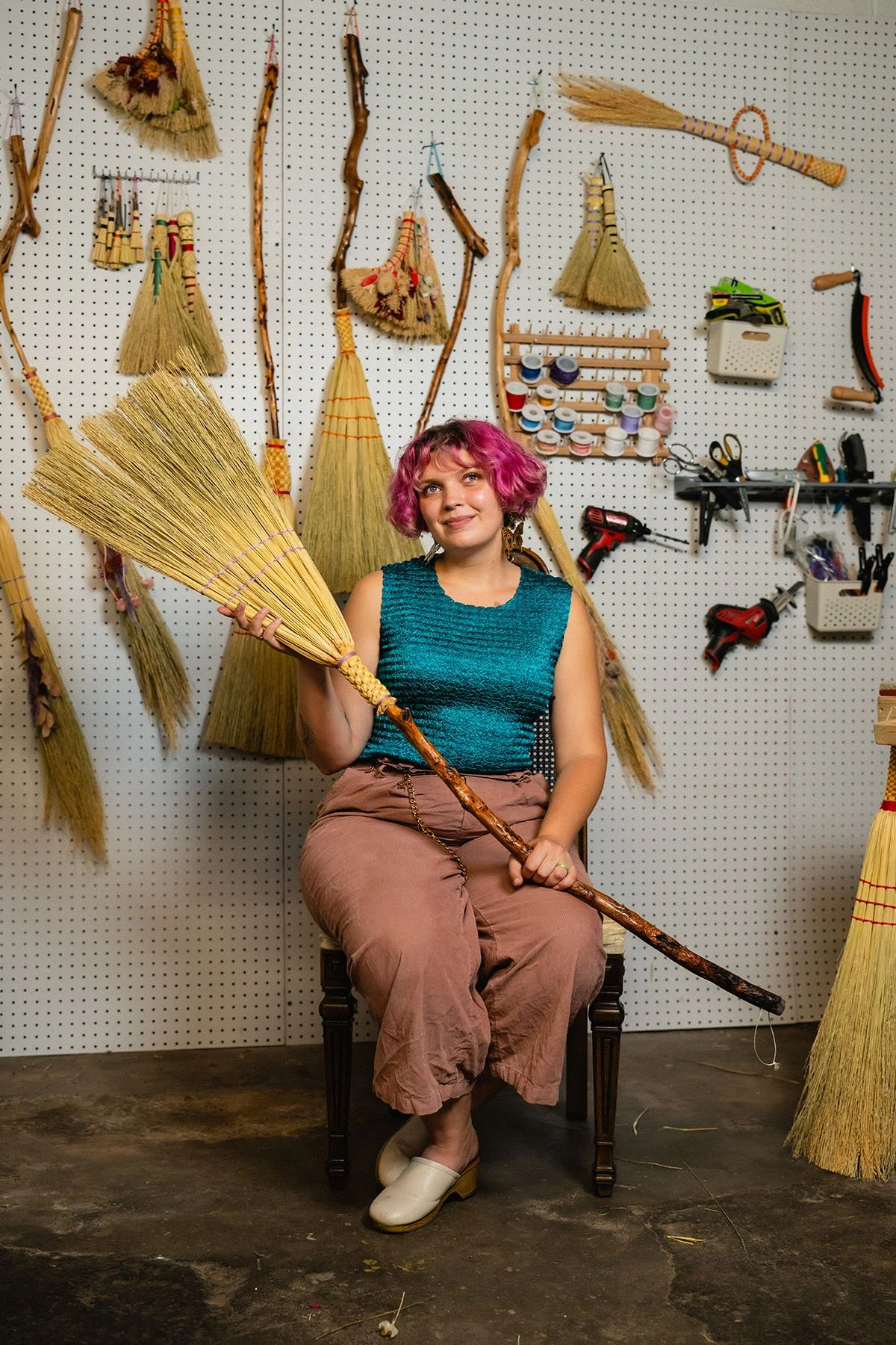 She made her first broom at age ten with her grandmother for her mother’s handfasting ceremony—an early moment where craft, ritual, and lineage converged. That experience continues to inform her work today. Jarrett views the studio as a living space, holding resolved works, functional objects, and experiments in progress, all part of an ongoing practice grounded in labor, care, and attention.